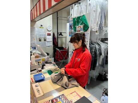 店舗受付にてお客様からお洋服をお預りしお洋服の状態確認します。クリーニング工場から仕上がってきたお洋服をお客様と一緒に確認しながらお渡しします。